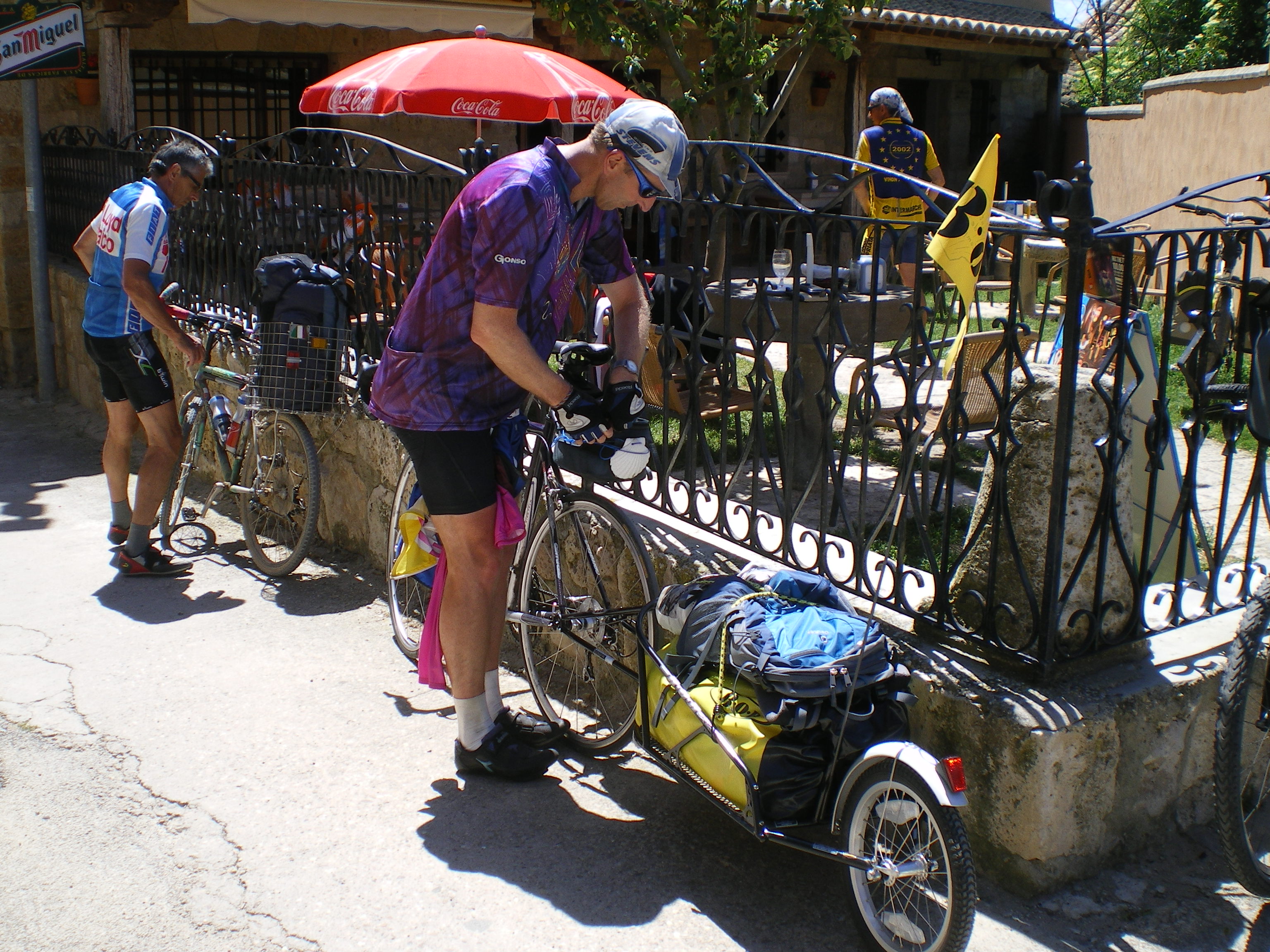 Ein kurzer Plausch während der Mittagsrast in Castrojeriz. Der sportliche junge Mann ist am 9. Mai in Cluny gestartet mit Ziel Santiago. Hat auch schon gut 1600 km auf der Uhr. Interessante Variante mit dem Anhänger. Gute Reise weiterhin für den Mann aus Euskirchen.