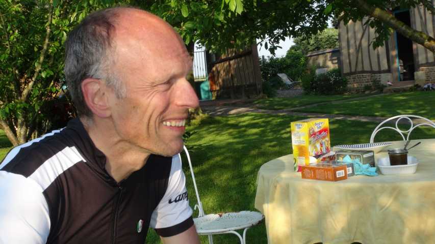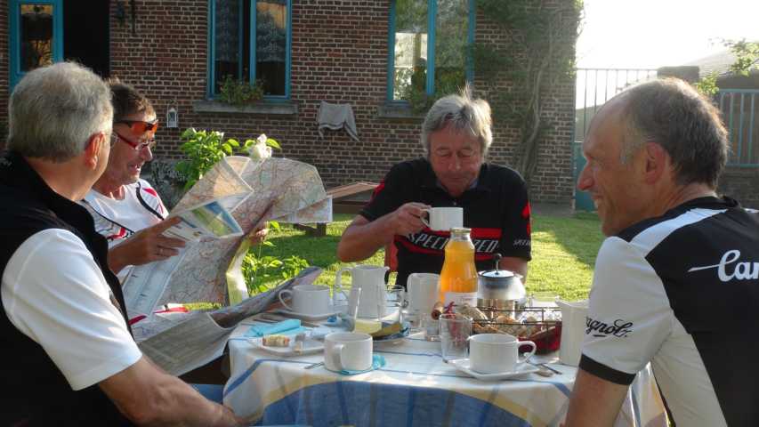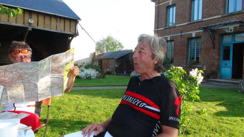 Rückblick zu gestern: Es war in der Tat ein langer Radtag mit vielen Kilometern aus der Champagne heraus und quer durch die Picardie, bei herrlichem Sonnenschein. Am Ende hatten sich im stetigen Auf und Ab dann rund 1300 Höhenmeter angesammelt. Berthold und Franzl haben sich zum Abend hin selbst übertroffen und ein wunderbares Quartier mitten in der „Pampa“ gefunden. Ein „Chambre d’Hôte“ der Extraklasse. Wir hatten einen herrlichen Tagesausklang im Garten des Anwesen bei bester Stimmung, gutem Essen und gutem Wein. Ein Tag wie wir ihn uns wohl alle vorgestellt hatten.